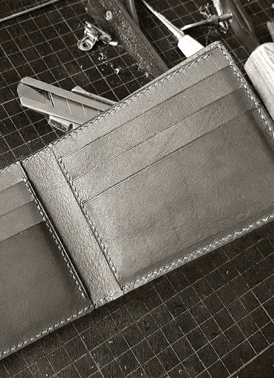 Each TZARO wallet is made with handpicked genuine leathers, we use a process of splitting leathers to get them to uniform thickness across all panels. The panels are backed with strong interlining material. The leathers are drum dyed and also are Reach complaint. The stitching is done with pattern stitching machine which ensures that stitch per inch is consistent across all the wallet including the edges We use cotton, poly-twill as well as leather to create the inside compartments. The compartment edges are leather lined in our case which adds to its strength. All TZARO wallets have corrosion free buttons which we use in the coin pockets.