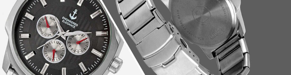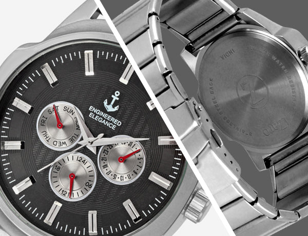 Powered with VX series of multifunction movement, this watch is designed to delight. The multifunction watch movement can be described as an evolved day date movement. The three sub dials detail - time in 24-hour format, while the date and day are displayed in the other two sub-dials. The 24-hour display is in sync with the watch time while the other 2 dials can be changed. The crown position works in 3 positions where the center position can be used to alter day & date. The position of these three sub-dials changes as per the movement. This Japanese movement will deliver immaculate performance well over decades.