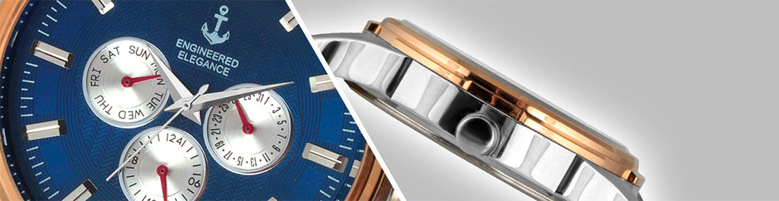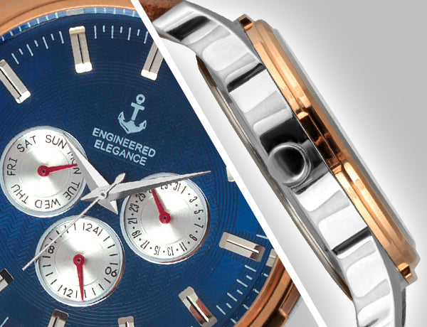 The Anchor is inspired by stamping textures mastered by Swiss brands. The intricate texture has been complemented with broad Steel Colored hand finished applied figures. We have taken a minimalist approach to branding and only used the mnemonic logo. The elegant rose gold plating has been combined with blue dial to give a stunning look. The strap has been hand-crafted out of genuine leather for both upper part as well as inside part. This multifunction is powered by Japanese VX3J movement and a long life Sony battery. The watch case has been ion plated with 0.3 microns of plating. It's also backed with stainless steel case back giving it extra resistance to sweat and making it water proof upto 3 ATM pressure. This is Beauty as well as Beast!