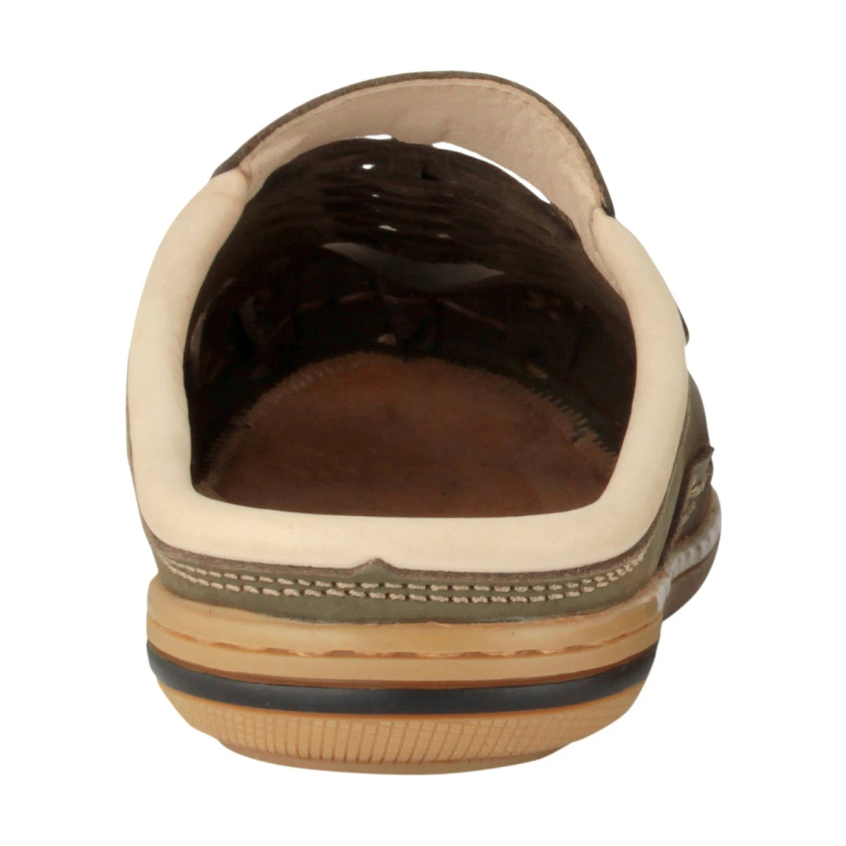 TZARO Olive genuine leather men's slipper made with True-Moccasin Construction technique Rubber Sole. These awesome shoes are leather lined from inside with a special leather which absorbs sweat very easily, keeping your feet cool. The slipper upper has been stitched into the sole (a process called channeling) which basically means that these will last a long time. Small window patterns have been done on the sides of the slippers to increase the air flow which helps in keeping your feet dry even when you use them over -longer duration.